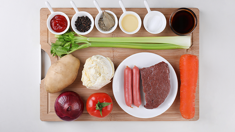 西红柿去皮切丁;土豆、胡萝卜去皮切丁;洋葱、西芹切丁;红肠切丝。