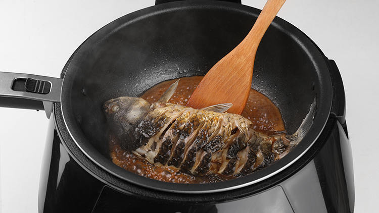 2、煎鱼的时候,一定要等油特别热,冒烟的状态下下姜片,再下鱼,不能翻动它。待一面煎黄了再翻过来煎另外一面,不要总去翻动它。