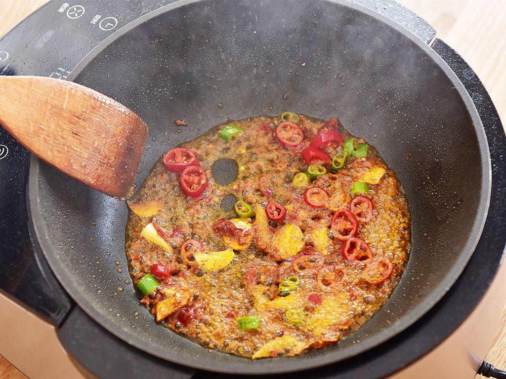 锅里放一点油,开火,加葱、姜、蒜、红椒,煸炒十秒钟后将鲫鱼和其它原料(除醋、葱花)放入锅中翻炒。