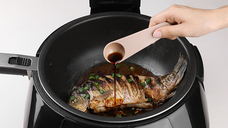 烹饪过程中手动翻面,加糖、加盐,胡椒粉、些许味精。加水,没过鱼身。盖盖,煮5分钟(少点也可以,熟了就好)。