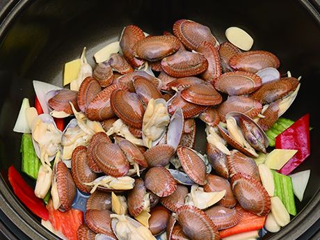 打开料理锅放入油,先下姜片和蒜片再将花甲放入锅中均匀地铺开,然后放入青辣椒块和红辣椒块;